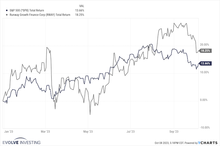 On a year-to-date total return basis, Runway Growth Finance Corp. (RWAY) has outperformed the S&P 500. This outperformance is notable as RWAY carries in my view lower overall risk relative to stocks, primarily because 99% of the loans in its portfolio are secured by the assets of the companies to which it lends.